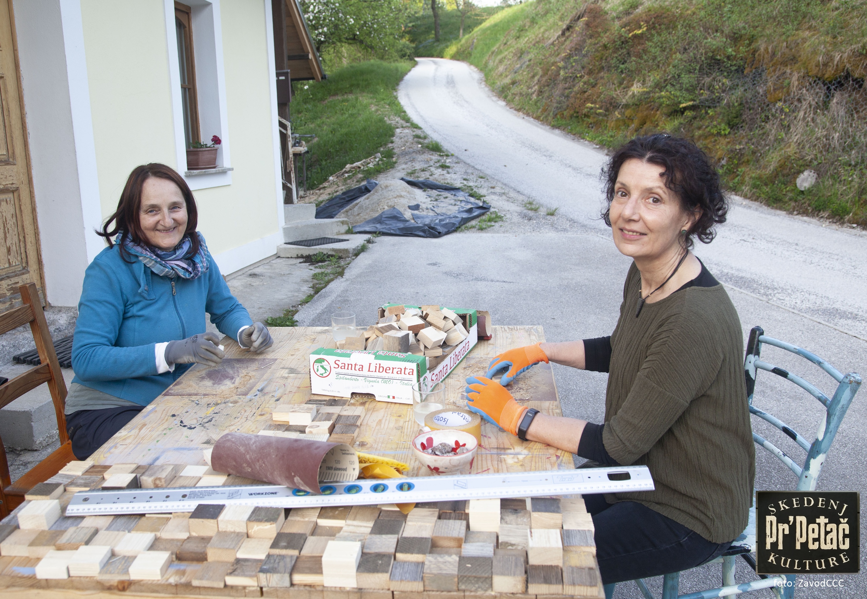 V začetku letošnjega junija bomo v Žlebah, v Skednju kulture Pr'Petač, kjer nastaja nov skupnostni ustvarjalni prostor, izvedli prvo večjo skupnostno, medgeneracijsko ustvarjalno delavnico v projektu HIŠA NA HRIBU - Skupaj na vasi, kjer se bomo kot mozaik lesenih ploščic, pridobljenih iz starih vrat tega skednja, v druženju in ustvarjanju, prepletli umetniki in vaščani.