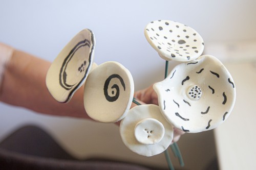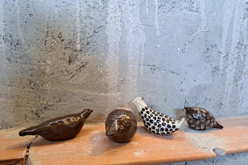 Pridobljeno znanje nadgrajuje skozi raznolike motive – včasih gre za stilizirane podobe živali ali rastlinja, drugič se poigrava z abstraktnimi oblikami. Njene keramične stvaritve so lahko uporabni predmeti ali pa so za okras – v notranjosti ali zunaj doma. Postavitev Lojzkinih del ustvarja prepletanje in razmejevanje med posameznimi artefakti, ki naseljujejo stavbe in okolico kulturne dediščine sv. Marjete.