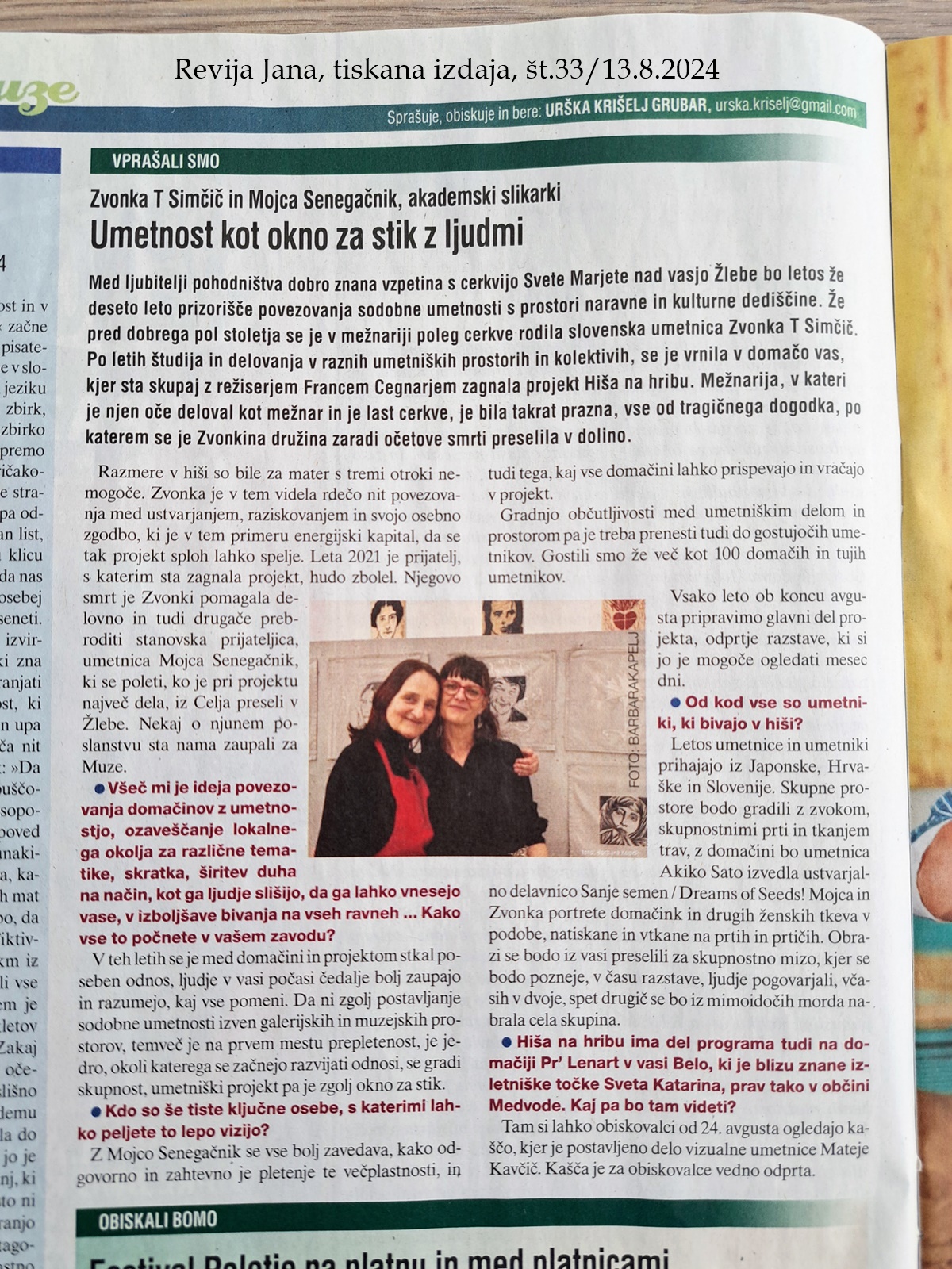 Za revijo Jana se je novinarka Urška Krišelj Grubar pogovarjala z Zvonko Simčič in Mojco Senegačnik pred letošnjo otvoritvijo razstav Hiša na hribu 2024.