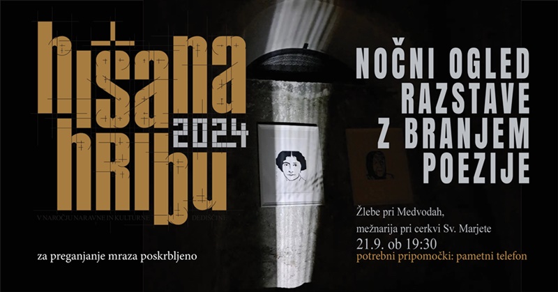 Ob jesenskem enakonočju se bomo od umetniškega druženja v Žlebah v soboto, 21. 9. ob 19.30 poslovili s posebnim, nočnim ogledom razstave HIŠA NA HRIBU 2024 v mežnariji, skednju in zvoniku cerkve Svete Marjete, z branjem poezije in s pogovori v zavetju nočnega neba.