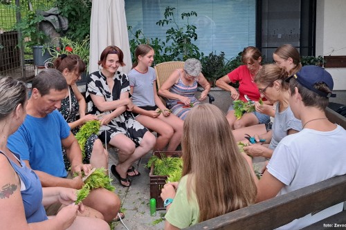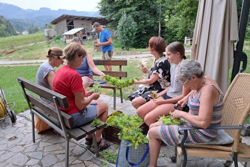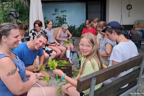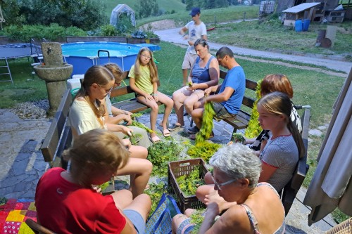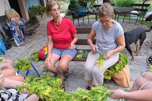 V petek, 19. julija, so nas domačini povabili k skupnostnemu delu! Skupaj smo pletli "krancl" za okrasitev cerkve Sv. Marjete.