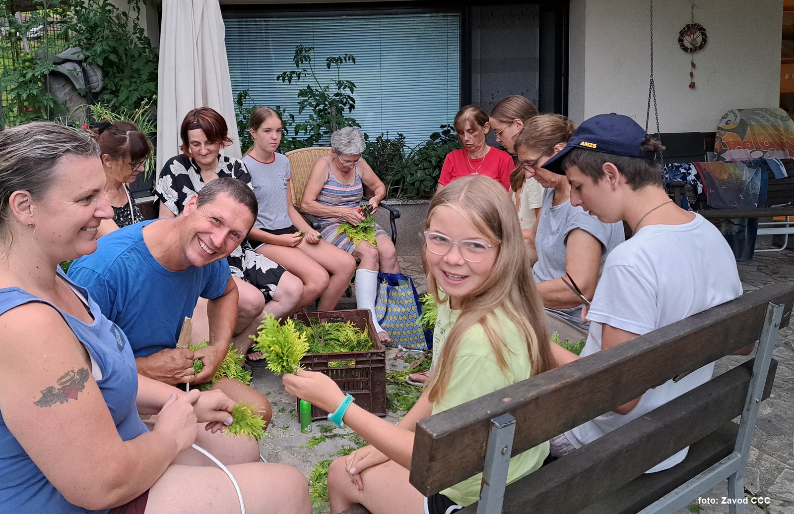 V petek, 19. julija, so nas domačini povabili k skupnostnemu delu! Skupaj smo pletli "krancl" za okrasitev cerkve Sv. Marjete.