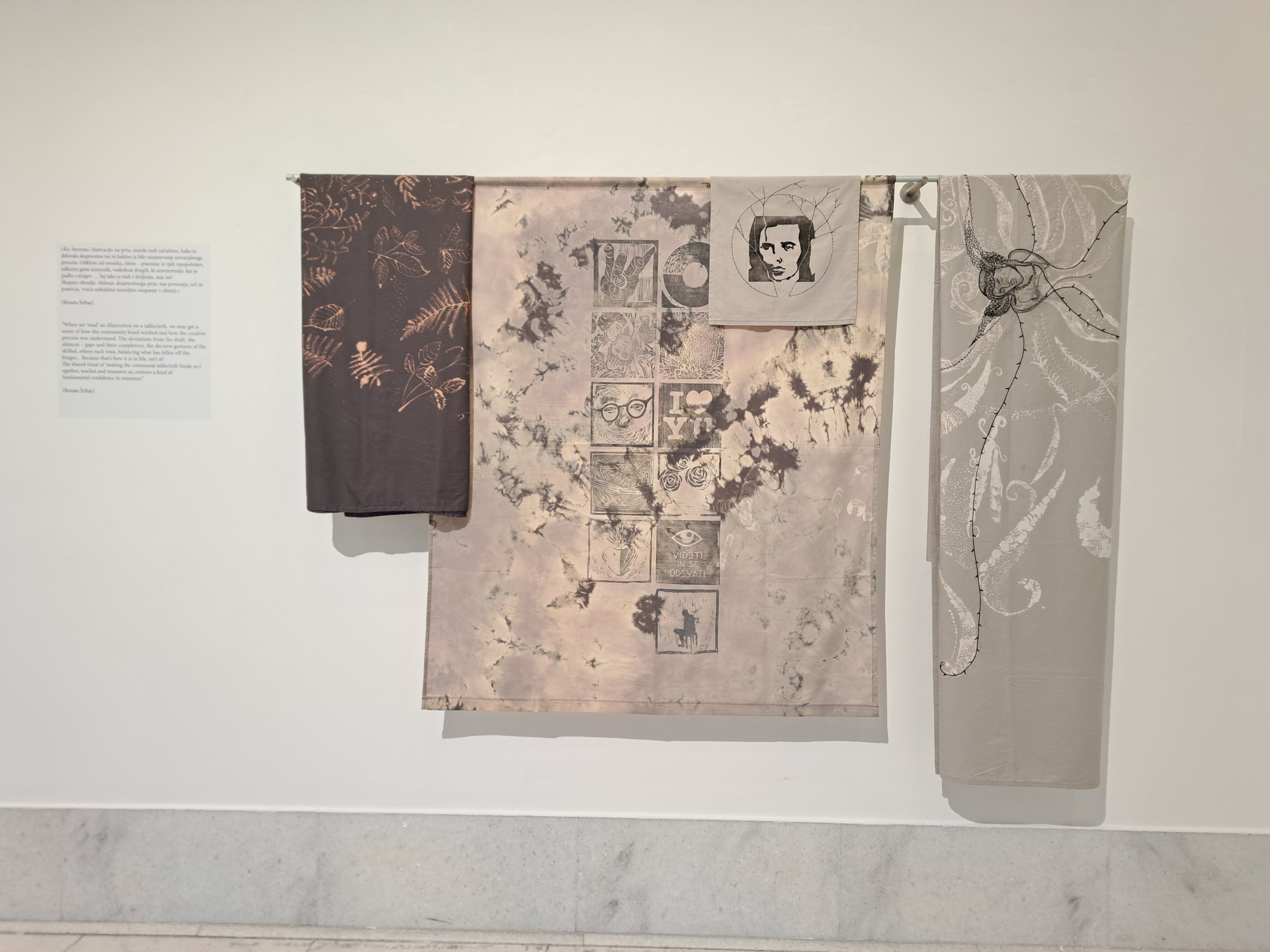Nekatere prte tudi potiskamo z originalnimi lesorezi in jih z vezenjem povežemo s tradicijo skupnostnih del ženskih rok in občutenja skupnosti.