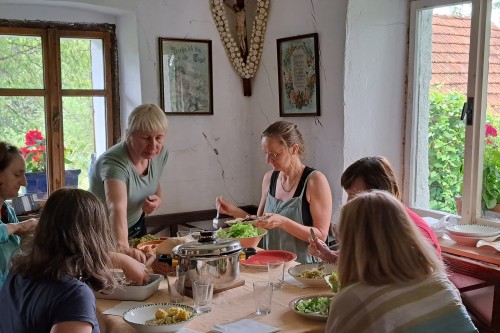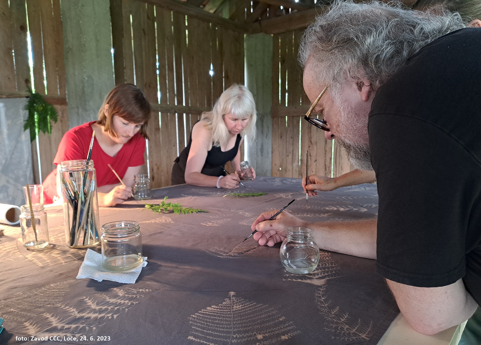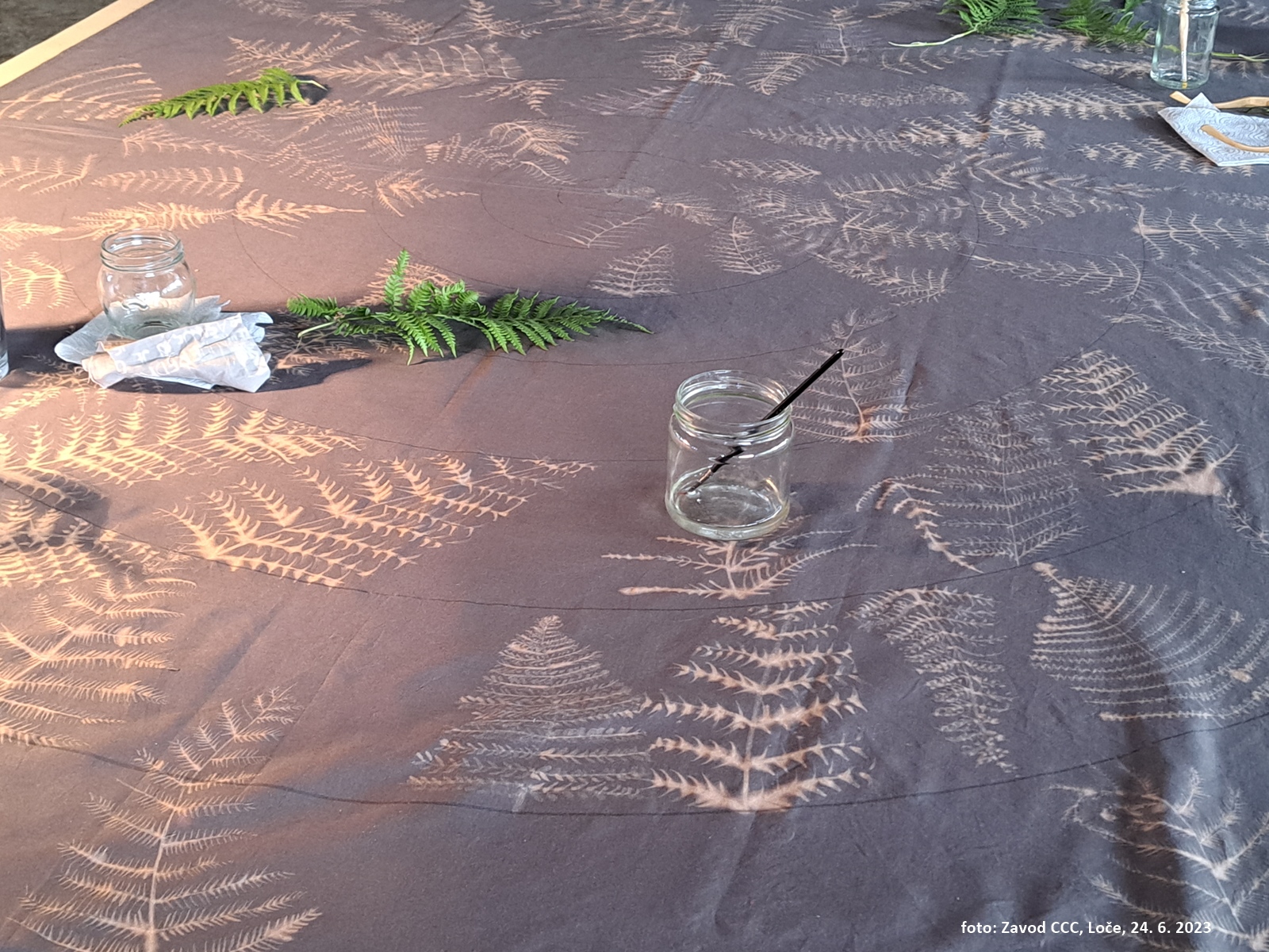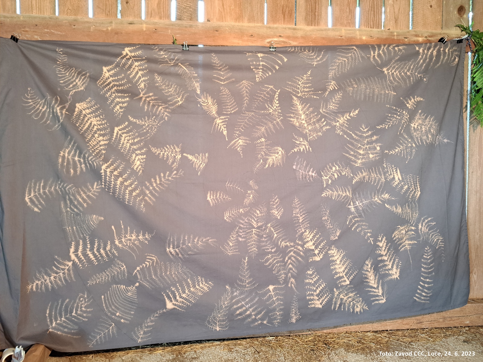 Ustvarjalna delavnica v pozdrav poletju, Loče, 23. in 24. 6. 2023 Ekipa ustvarjalcev, zbranih v delovanju Hiše na hribu je preživela kresno noč in kresni dan v gosteh na ekološki kmetiji Terezija v Ločah ob Šmartinskem jezeru pri Celju. Večerno druženje v 500 let stari hiši, v skupnostnem glasbenem ustvarjanju zasedbe Silvanium z ostalimi gosti, se je nadaljevalo v čarobni nočni sprehod s Katko, na delavnico nočnega opazovanja gliv s pomočjo UV svetilke, naslednji dan pa smo v razširjeni zasedbi pozornost namenili skupnostnemu ustvarjanju novega prta z motivom čarne rastline, praproti. Prt smo ustvarili Ema, Amelita, Katarina, Olivija, Anja, Mateja, Louise, Mojca, Damjana, Zvonka, Blaž in Mojca.